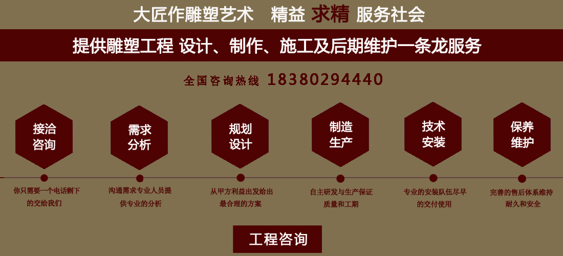 成都大匠作雕塑有限公司,是經(jīng)成都工商局審定注冊的正規(guī)專業(yè)雕塑制作及工程安裝服務(wù)機構(gòu),是由一群年輕富有朝氣的年輕人創(chuàng)辦,發(fā)軔于四川省成都市龍泉驛區(qū)。它是一家******于創(chuàng)作、制作和銷售為一體的公司。大匠作擁有多年從事公共藝術(shù)的專業(yè)人員和雕塑制作人組成的核心團隊,為您提供專業(yè)、具創(chuàng)新的設(shè)計及制作服務(wù)。公司成立以來,秉承“******服務(wù)、誠信為本”的宗旨,以客戶需求為目標導(dǎo)向,不斷學習,進取,優(yōu)化和提高服務(wù)質(zhì)量,公司向您******——“您的滿意***是我們的信譽”,我們將以飽滿的熱情和******的服務(wù)贏得您的贊譽和支持。